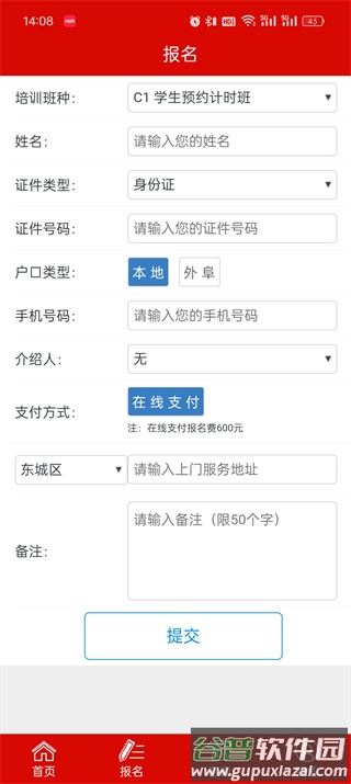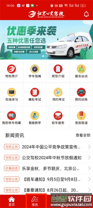 1、打开公交驾校app,进入首页后切换到【报名】页面;