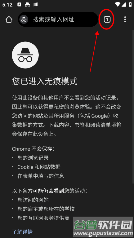 在无痕模式下,点击右上角相应图标查看当前窗口;