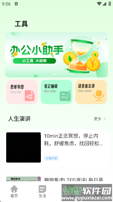 7、工具栏中包含思维导图、笔记、语言备忘录等实用工具,同时提供励志演讲等优质内容。