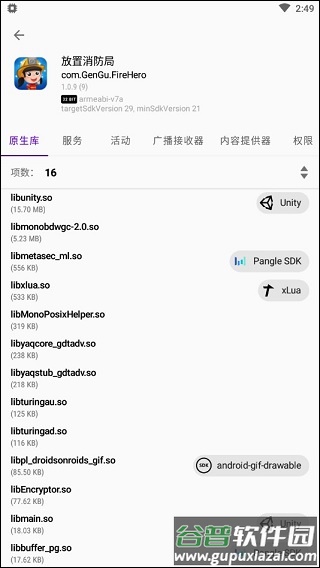 该工具专注于解析应用集成的第三方库资源,提供ABI架构分析功能,可区分32位与64位应用。能完整展示原生库文件列表,同时解析四大核心组件:服务、活动、广播接收器与内容提供器。