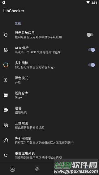 该工具支持系统应用的完整显示,用户可自主控制是否在列表中展示系统级程序。具备APK文件分析能力,点击安装包即可进入详情界面。部分知名第三方库会以彩色图标呈现,提升辨识度。规则库数据可通过Gitee平台实时更新,确保标记信息保持最新。可设定库引用数量阈值,仅显示达到设定值的依赖项。当应用列表显示异常时,可使用重载功能刷新数据。