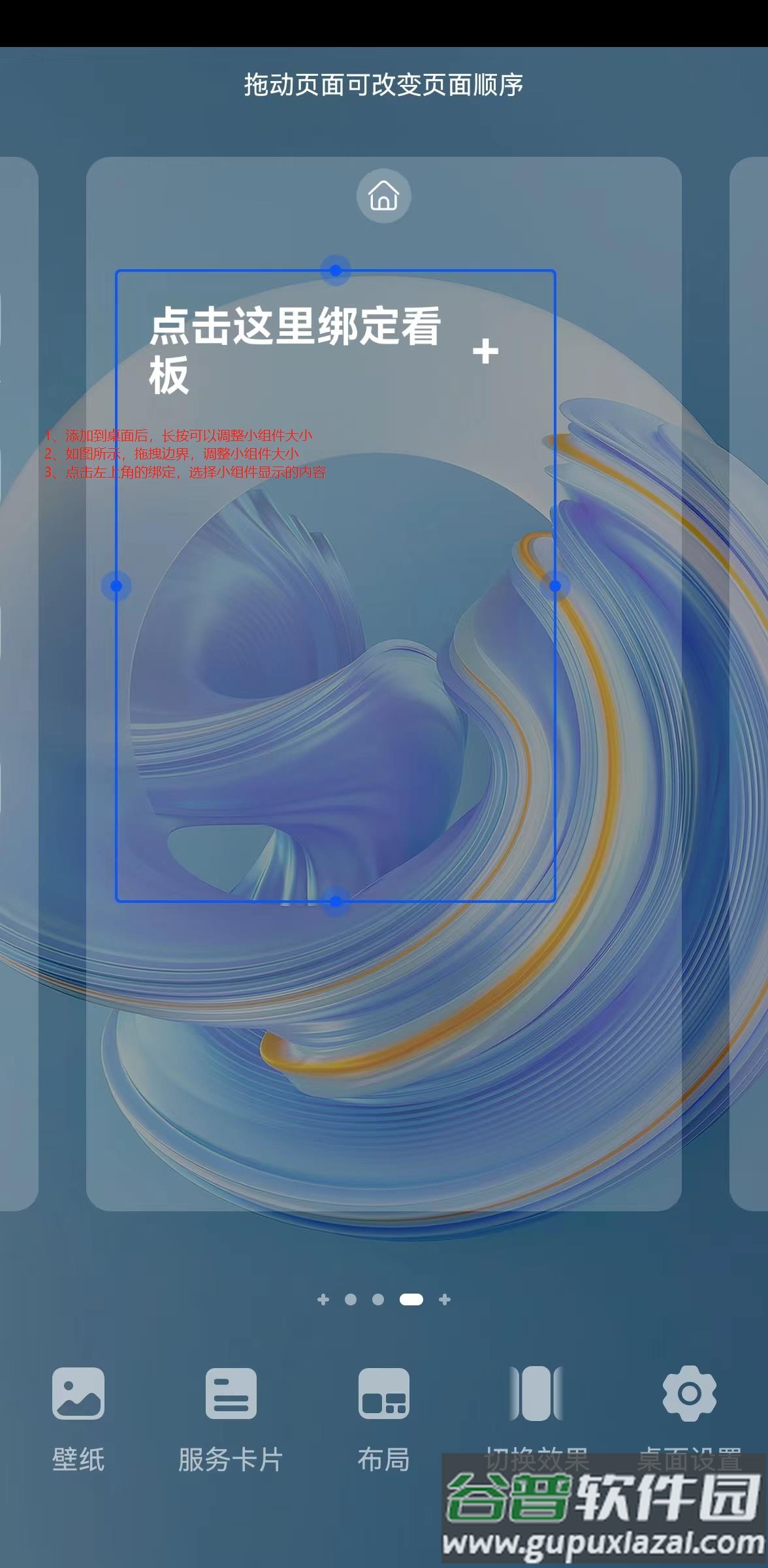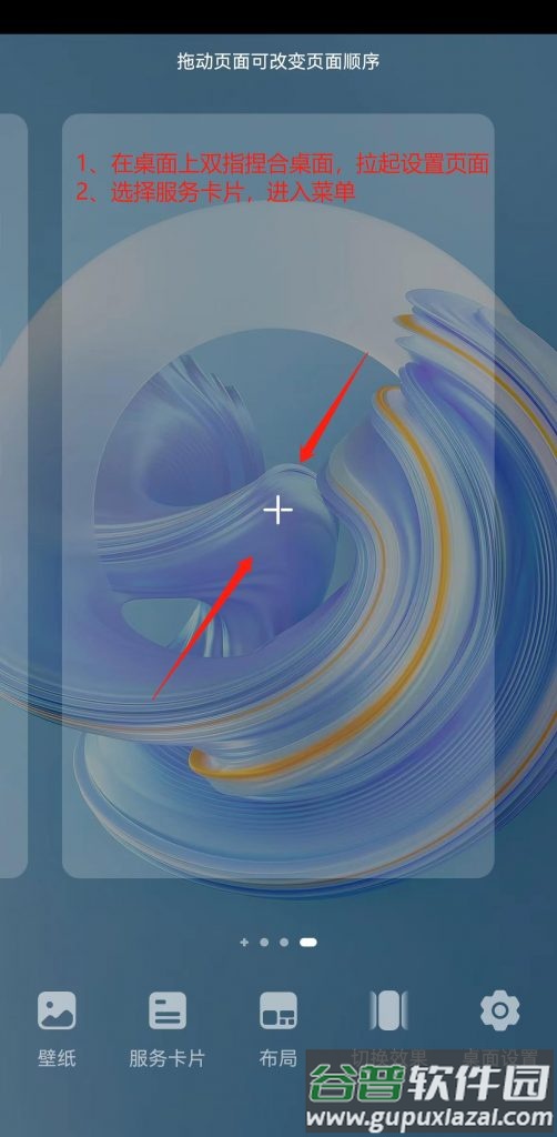 第一步:在手机桌面双指捏合,进入桌面设置界面,选择一个空白页面较多的桌面,点击底部“服务卡片”选项,开始添加桌面插件;