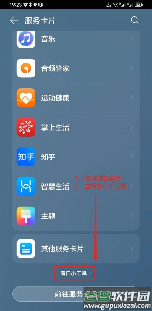 第二步:滑动服务卡片列表至最底部,进入“窗口小工具”列表;