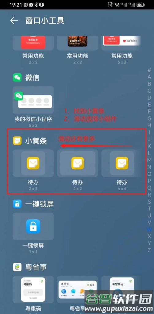 第三步:在窗口小工具列表中找到“小黄条”,左右滑动可查看所有可用的小工具样式;