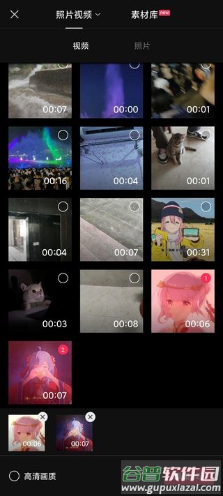 2. 从相册或素材库中选择两段以上视频素材,点击添加导入;