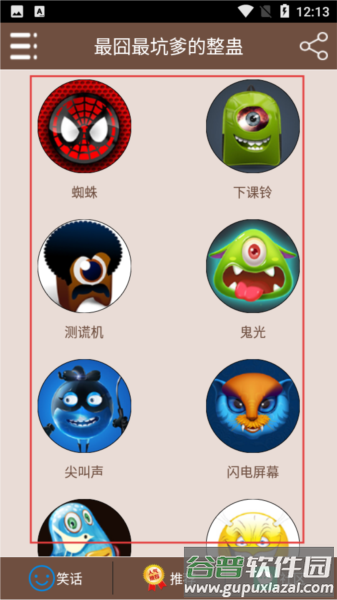 1、进入应用后能看到多种互动选项,包括蜘蛛动画、下课铃声、测谎游戏等,轻触红色标记处的功能图标就能启动对应效果。