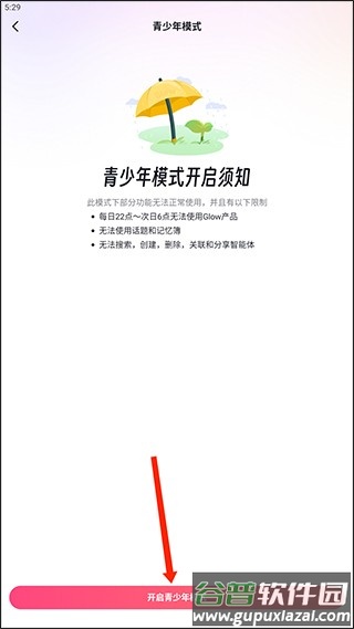 3、进入功能设置页,直接点击底部显示的【开启青少年模式】按钮,立即生效。