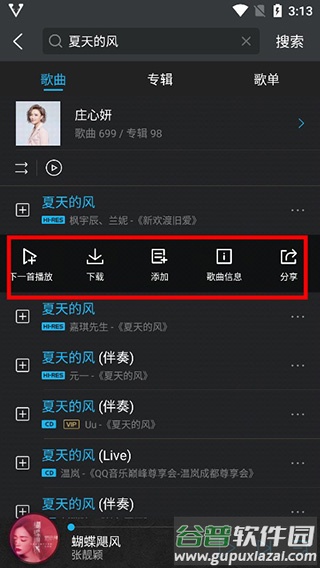 3.从搜索结果中选择歌曲播放,支持下载与分享功能;