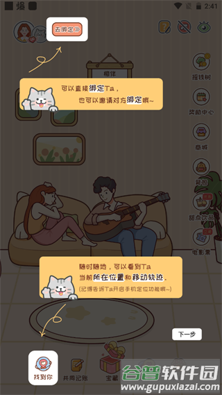1、完成安装并登录后,可在左上角绑定伴侣信息;点击“找到你”即可查看对方实时位置与移动轨迹。