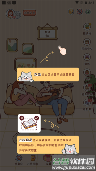 3、双击空白处可切换界面显示状态;长按物品进入编辑模式,移动或取消放置,取消后物品将返回背包等待再次使用。