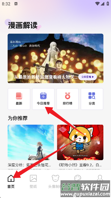 3、进入软件首页后,可以看到每日推荐的漫画内容;