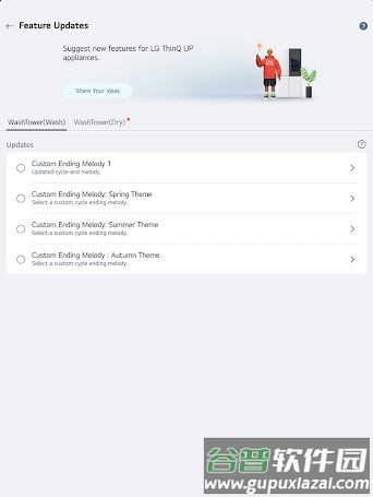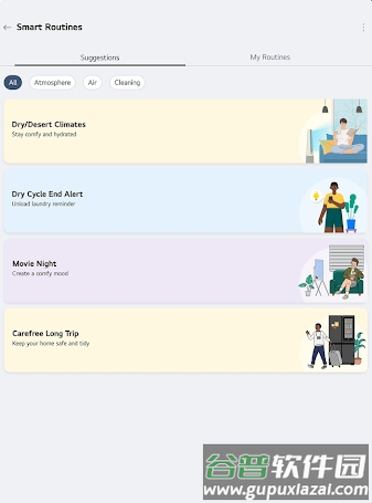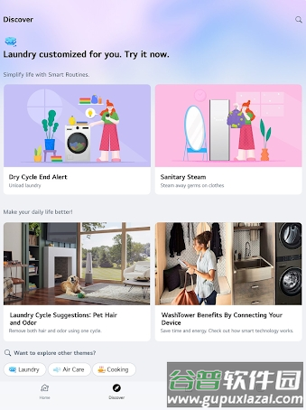设备连接与管理:支持接入冰箱、洗衣机、干衣机、烤箱、智能吸尘器、衣物护理机等多种LG家电,用户可统一添加并管理设备,实现集中操控;