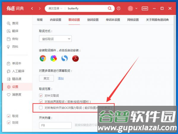 4、接着在“取词范围”中勾选“对所有软件开启OCR强力取词”选项,完成设置后,将鼠标指针悬停在任意文字上方即可触发即时翻译;