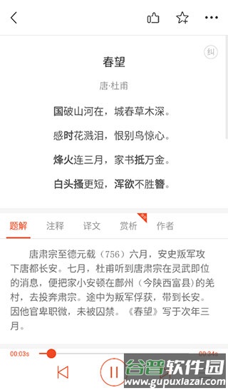 5、点击播放按钮开启音频诵读,同步查看题解、注释、赏析及作者生平介绍。