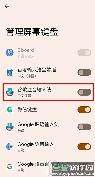 2、进入虚拟键盘管理页面,找到谷歌注音输入法并启用它;