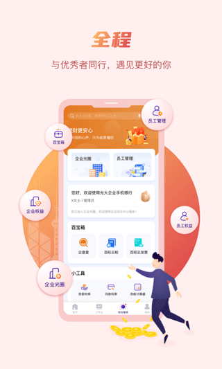 2、企业光圈:打破“客户”身份理念枷锁,为企业“用户”服务。用户不分行内外,在线认证企业信息,成为企业光圈用户,一键邀请企业员工加入光圈,为企业提供人力管理、合作伙伴资讯查询、财税管理、创业扶持、企业品牌推广等一站式企业全生命周期增值服务。通过企业光圈打造企业与企业的关联圈,企业与员工工作圈。