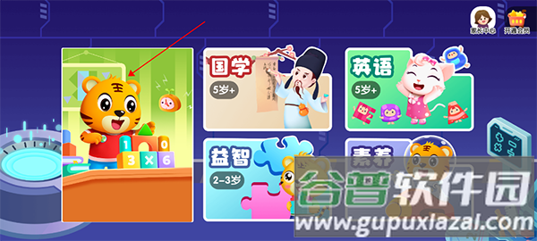 孩子打开软件后,点击下图红色箭头指示的区域。