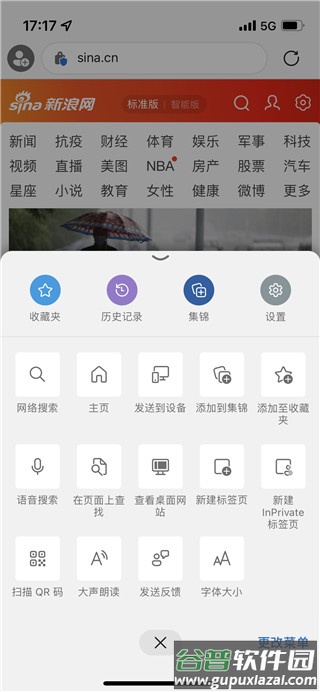 菜单中包括收藏夹、历史记录等选项,向上滑动可看到更多工具,其中包含“大声朗读”功能;