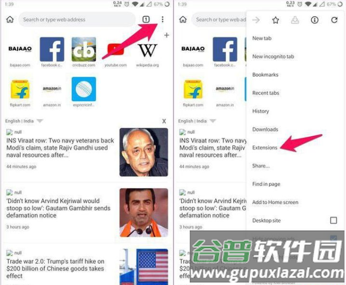 步骤1:点击主页右上角的三点菜单图标,选择“扩展”选项。