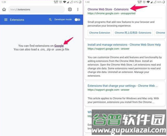 在Kiwi浏览器地址栏输入chrome://extensions并访问;开启开发者模式;随后访问Chrome网上应用店(网址:https://chrome.google.com/webstore/category/extensions),搜索插件名称并安装;也可通过本地crx文件解压后安装,网上有许多提供插件下载的网站。
