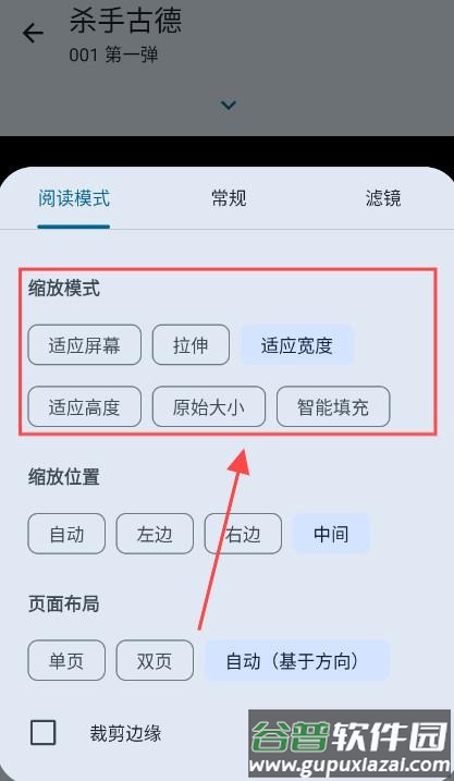 2、在阅读设置菜单中向下滑动,找到缩放模式选项,选择适合的显示方式;