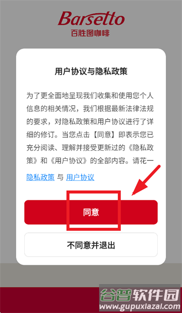 下载安装并打开百胜图咖啡app,先同意用户协议与隐私政策;