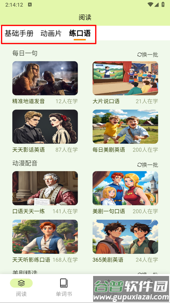 2、首页展示基础手册、动画视频和口语练习等模块,用户可根据目标自由选择。