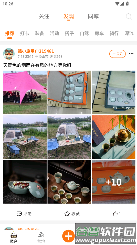打开首页即可浏览各类露营动态,滑动查看同城活动、营地推荐等信息。