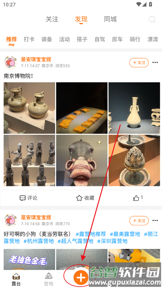 点击“记录”功能,上传图片、文字记录露营生活,发布后可与他人分享。