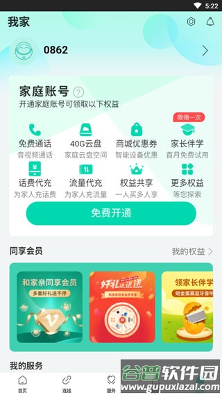 5、点击“我家”页面,可以开通家庭账号,管理全家共享的服务。