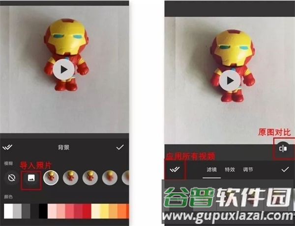 若不满意视频背景,可点击主界面背景选项进行修改。InShot提供大量特效与滤镜,调整方式如右图所示: