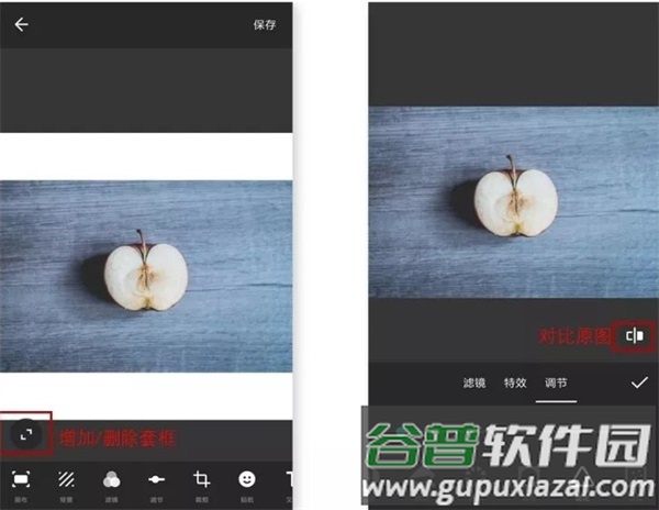 至此可见视频、照片与拼图功能的操作界面基本一致。照片修饰主要使用调节功能,常用参数包括亮度、对比度、褪色与暗角等。