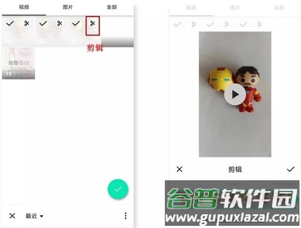 主界面点击视频按钮可选取本地视频。选择素材后点击剪刀图标进行初步剪辑。剪辑完成后点击右下角对钩确认。