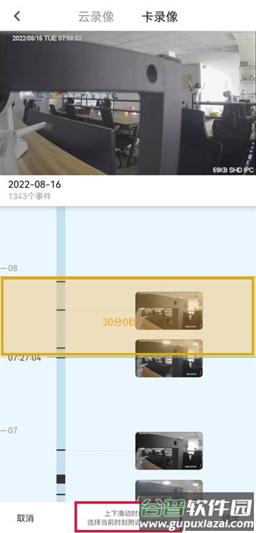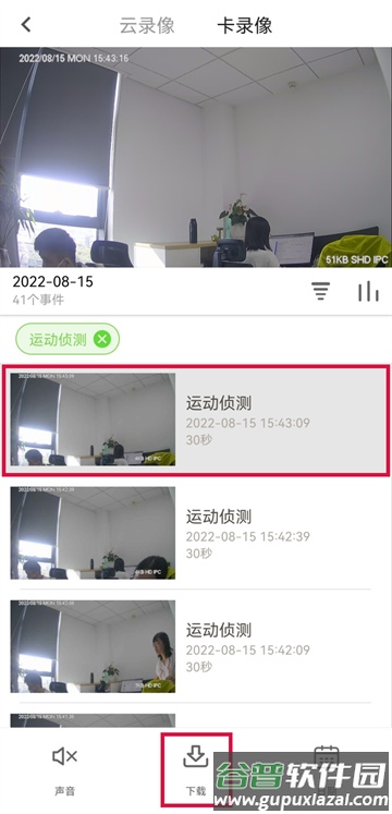 方式一:打开APP,进入【回看】的【卡录像】页面,将时间轴滑动到想要下载的时间点,点击底部【下载】,可以上滑或下滑时间轴,支持30分钟内的录像进行下载。