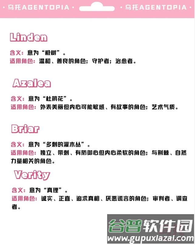10.Azalea:意为“杜鹃花”;适合外表美丽但内心敏感、有故事的角色;带有艺术气质。