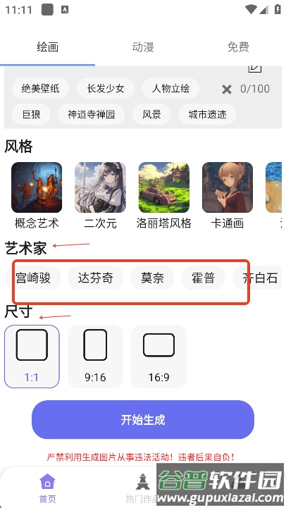 然后挑选艺术家风格与图片尺寸,最后点击“开始生成”,即可获得AI生成的图片。