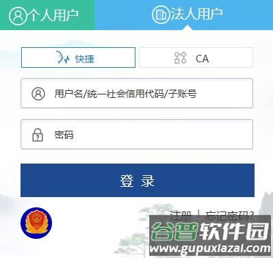 (二)法人登录:在登录页面点击“法人用户”后,可通过两种方式登录;1.快捷登录,使用用户名、统一社会信用代码或子账号配合密码登录;2.CA登录,请确保UKey已插入电脑,若未安装驱动请先点击登录页面链接下载对应驱动。