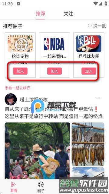 2、或点击底部“圈子”栏目,使用搜索或发现功能。