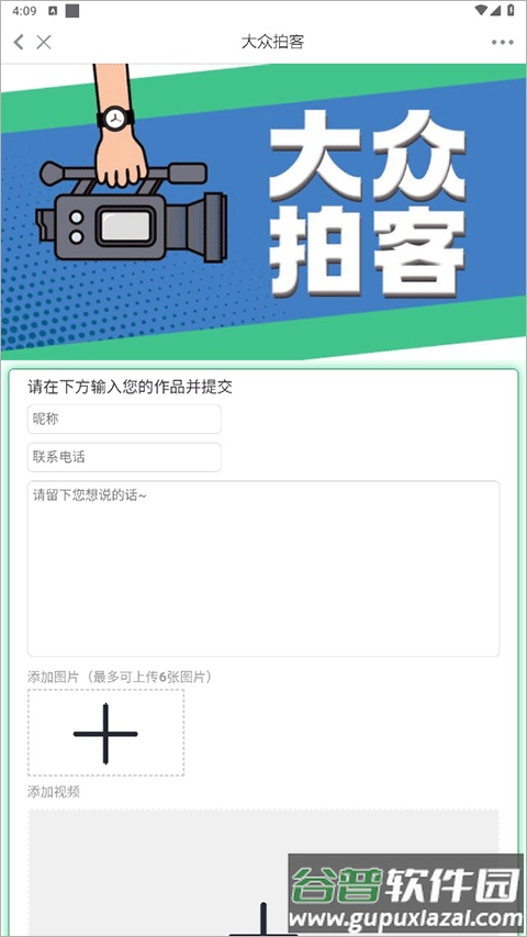 3、在作品提交页面,填写昵称、联系电话、想说的话,并上传图片或视频,最后提交信息即可。