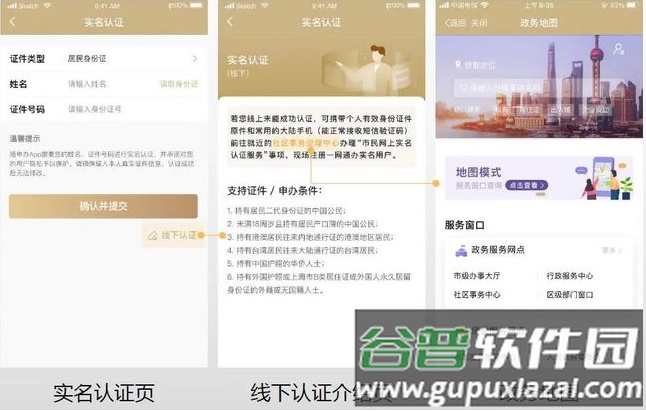实名认证页面设有线下认证入口,点击提示的社区事务受理中心可跳转至政务地图,方便查找就近网点;