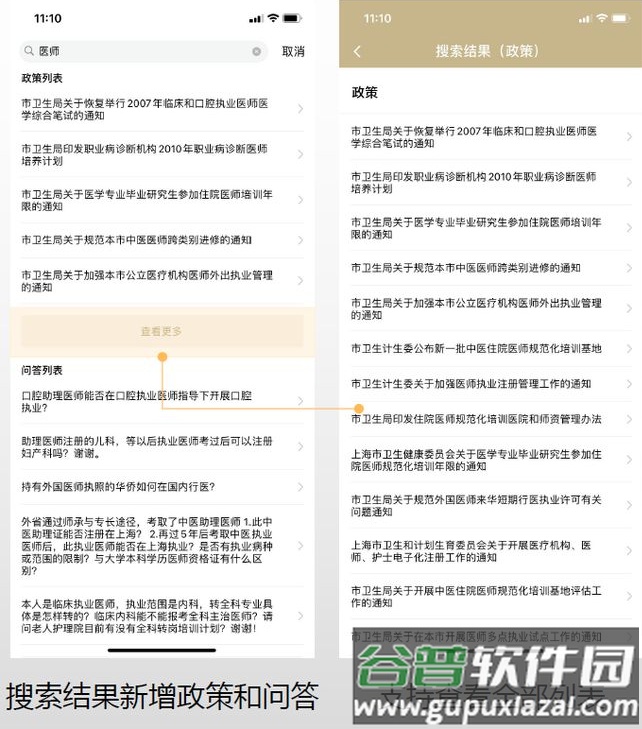 搜索结果新增展示政策与问答内容;可点击更多查看全部办事指南、政策及问答页面;