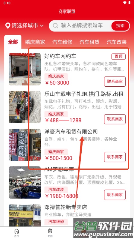 2、打开应用后即可浏览婚车租赁信息,或登记自己的车辆进行出租;