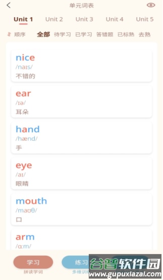 4、功能设计全面实用:每个单词配备教材中的典型例句,结合句子跟读与听力训练,让用户在语境中掌握单词用法。