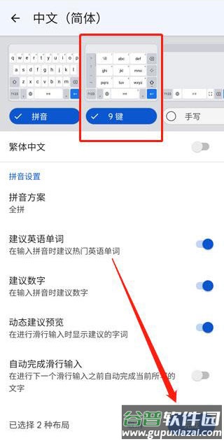 5、页面顶部显示九键标识,点击即可添加;若只需九键可取消全键盘勾选,完成后确认保存。