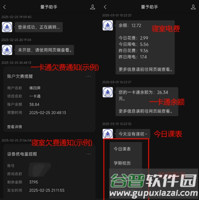 4、设置成功后即可查询电费、课表、校历等多种信息。