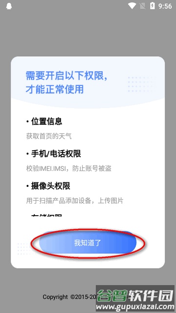 3、进入应用后按要求开启相关权限,点击“我知道了”继续;