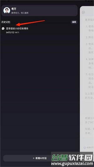 4、点击界面左上角头像,可以查看历史问答记录,便于用户回溯内容。