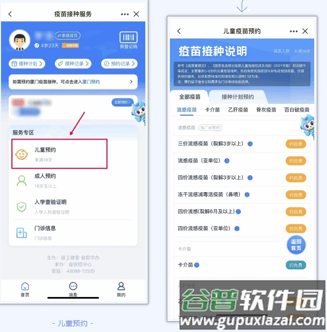5、在“服务专区”点击对应预约入口,以儿童预约为例:进入儿童预约页面后,选择需要接种的疫苗类型。