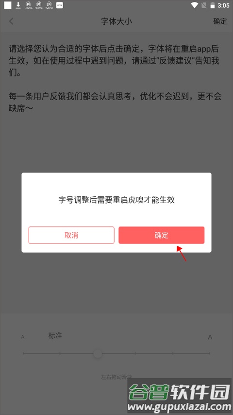 3. 页面将提示字号调整需重启应用才能生效,点击确定继续。
