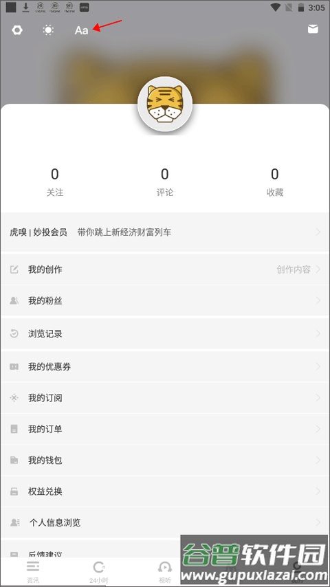 1. 使用手机号与验证码完成注册登录,从主界面切换至【我的】页面,点击左上角字母图标。